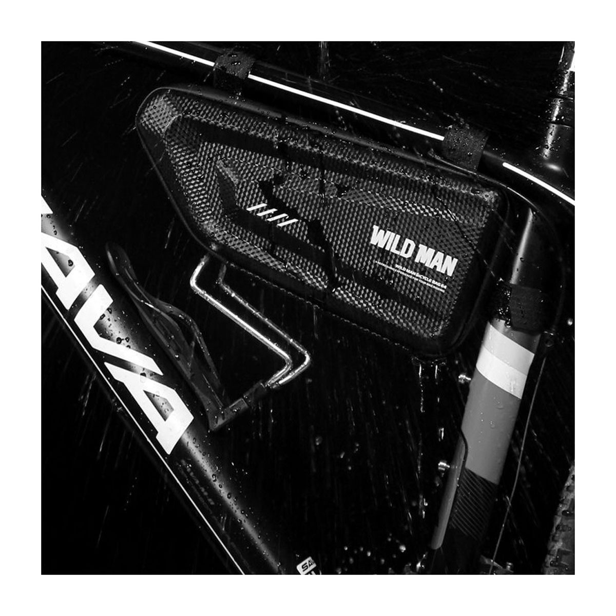 WildMan Hardpouch Bike Mount -pyörälaukku, Malli E4, musta on valmistettu laadukkaasta ja kestävästä PC-muovista. Laukku suojaa puhelintasi tehokkaasti myös mahdollisen törmäyksen tai pyörän kaatumisen aikana. Kiinnitys pyörän runkoon tapahtuu säädettävillä remmeillä, joten laukku pysyy mukana kovemmassakin menossa.