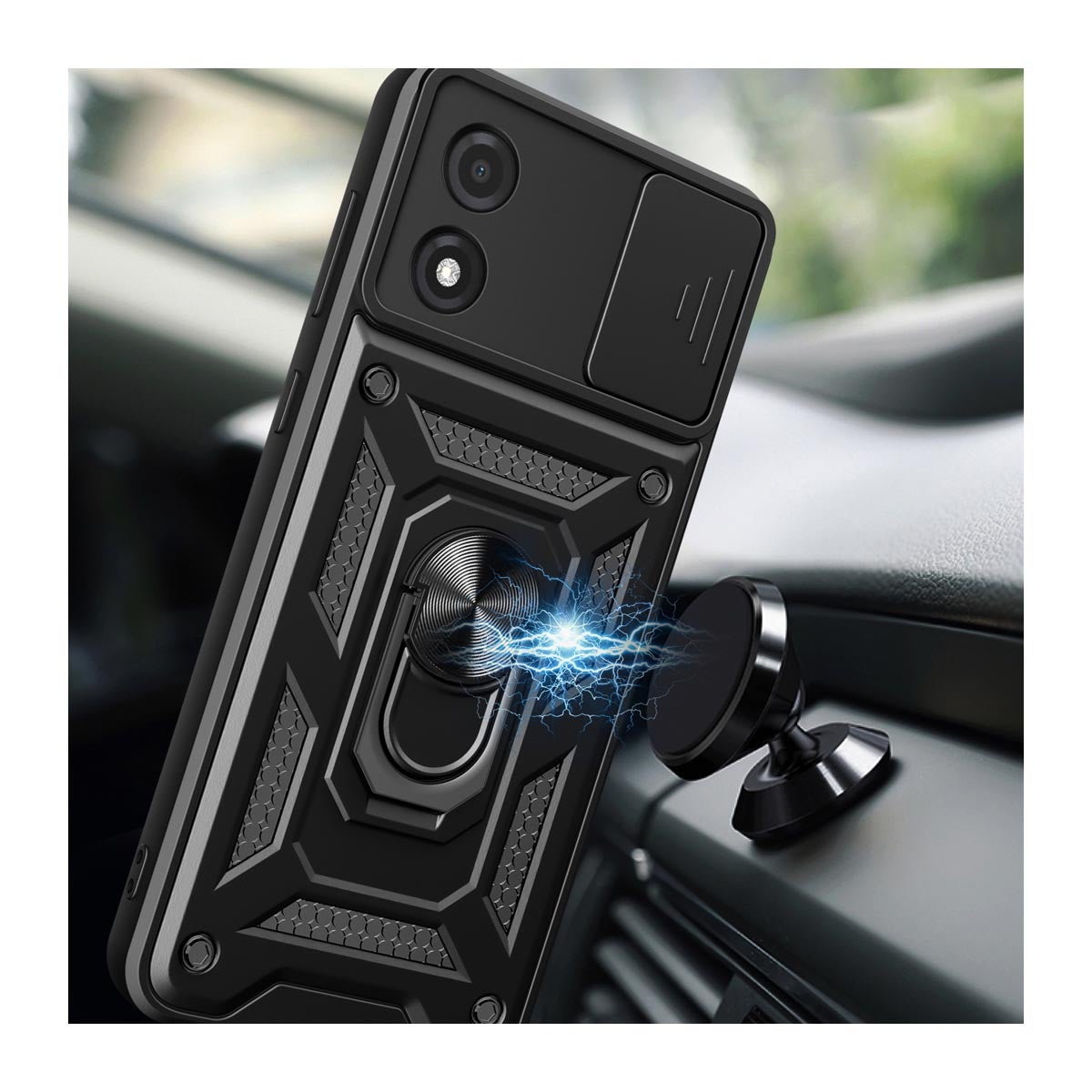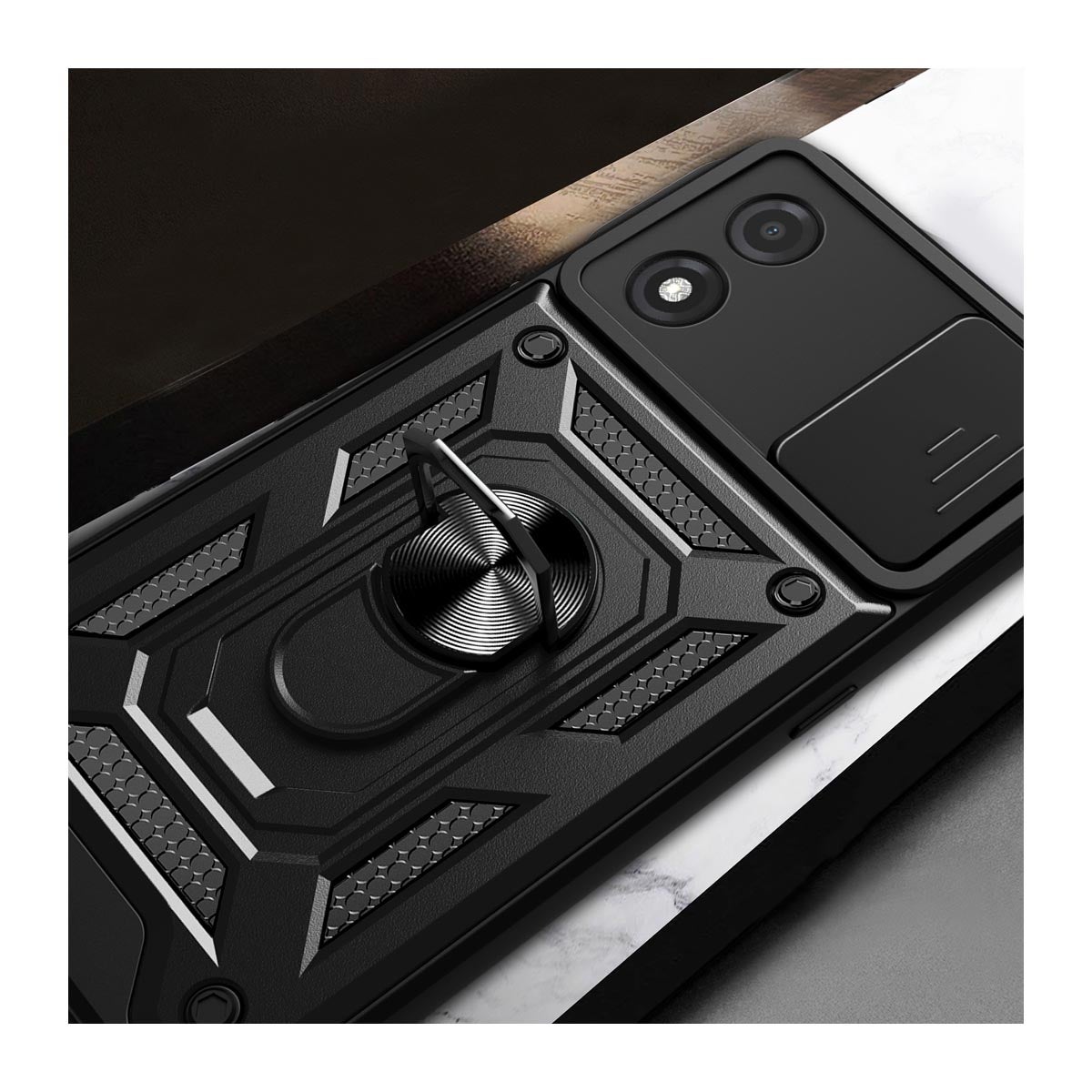 Suojakuoret kamerasuojalla ja sormuksella ovat multitaskaajan unelmakuoret. Yhdellä kädellä puhelimen selaaminen ei ole koskaan ollut näin helppoa. Metallinen otesormus kiinnittyy myös esimerkiksi magneettiseen autotelineeseen. Jos taas haluat nauttia videoiden katselusta, otesormus muodostaa nojan eri suuntiin juuri niin päin kuin haluat. Kaikki portit, liittimet ja reiät ovat käytettävissä suojakuoren kanssa normaaliin tapaan. Suojakuori kamerasuojalla ja sormuksella on tyylikäs ja monikäyttöinen suoja puhelimellesi.