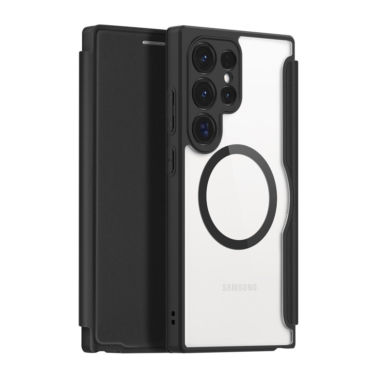 Dux Ducis Skin-X Pro Galaxy S24 Ultra 5G -lompakkokotelo, Musta on upean näköinen, MagSafe-renkaalla varustettu suoja laitteellesi. Kotelon tausta on valmistettu vahvan PC-materiaalin ja joustavamman TPU-materiaalin yhdistelmästä maksimaalisen suojan takaamiseksi. Näytön suojaksi taittuu PU-materiaalista valmistettu kansi, johon saat sujautettua myös tärkeimmän korttisi.